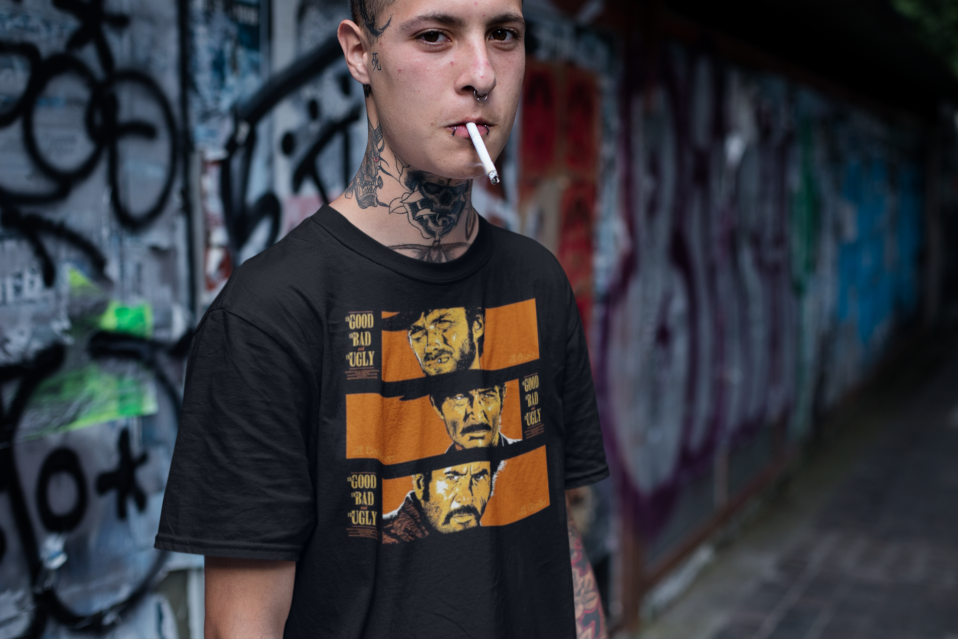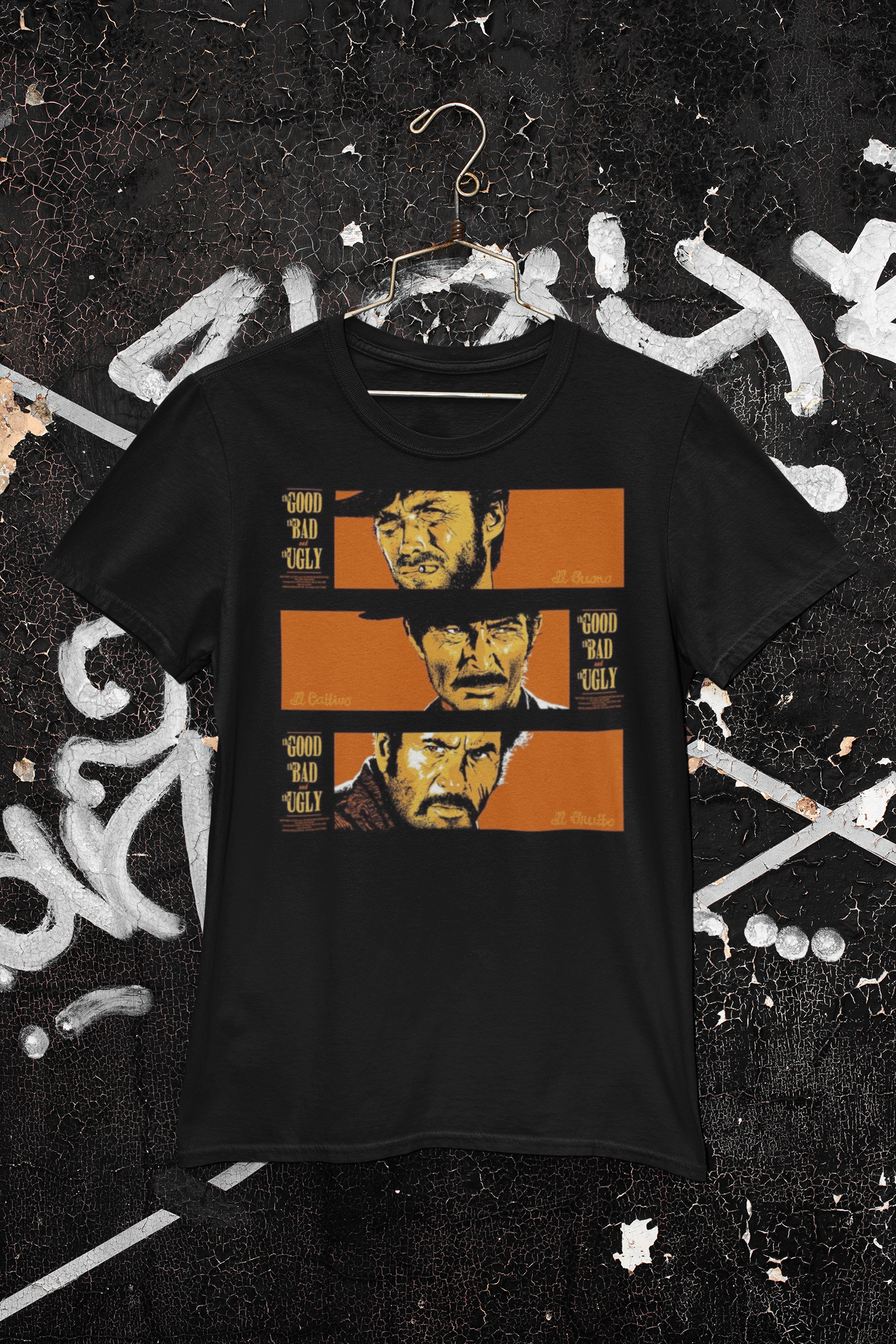 Ride into the frontier with this The Good, the Bad and the Ugly Graphic T-Shirt, inspired by Sergio Leone’s 1966 Spaghetti Western masterpiece. Featuring Clint Eastwood as Blondie (The Good), Lee Van Cleef as Angel Eyes (The Bad), and Eli Wallach as Tuco (The Ugly), this shirt celebrates one of cinema’s most legendary trios.
